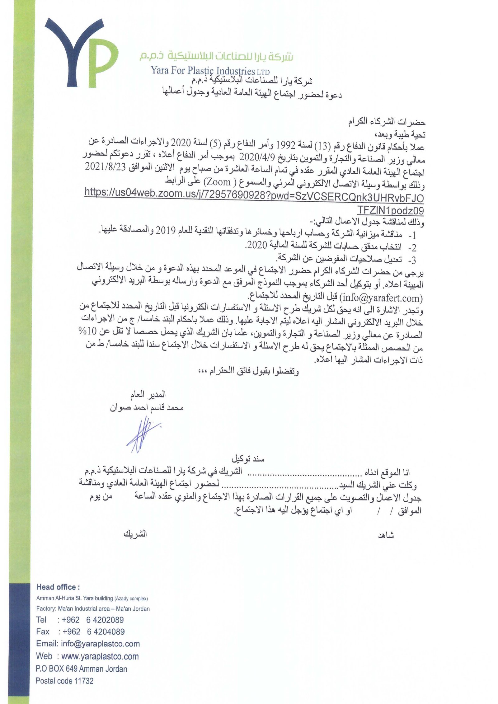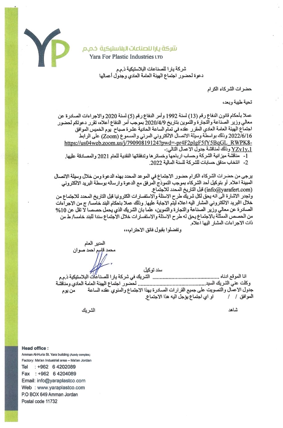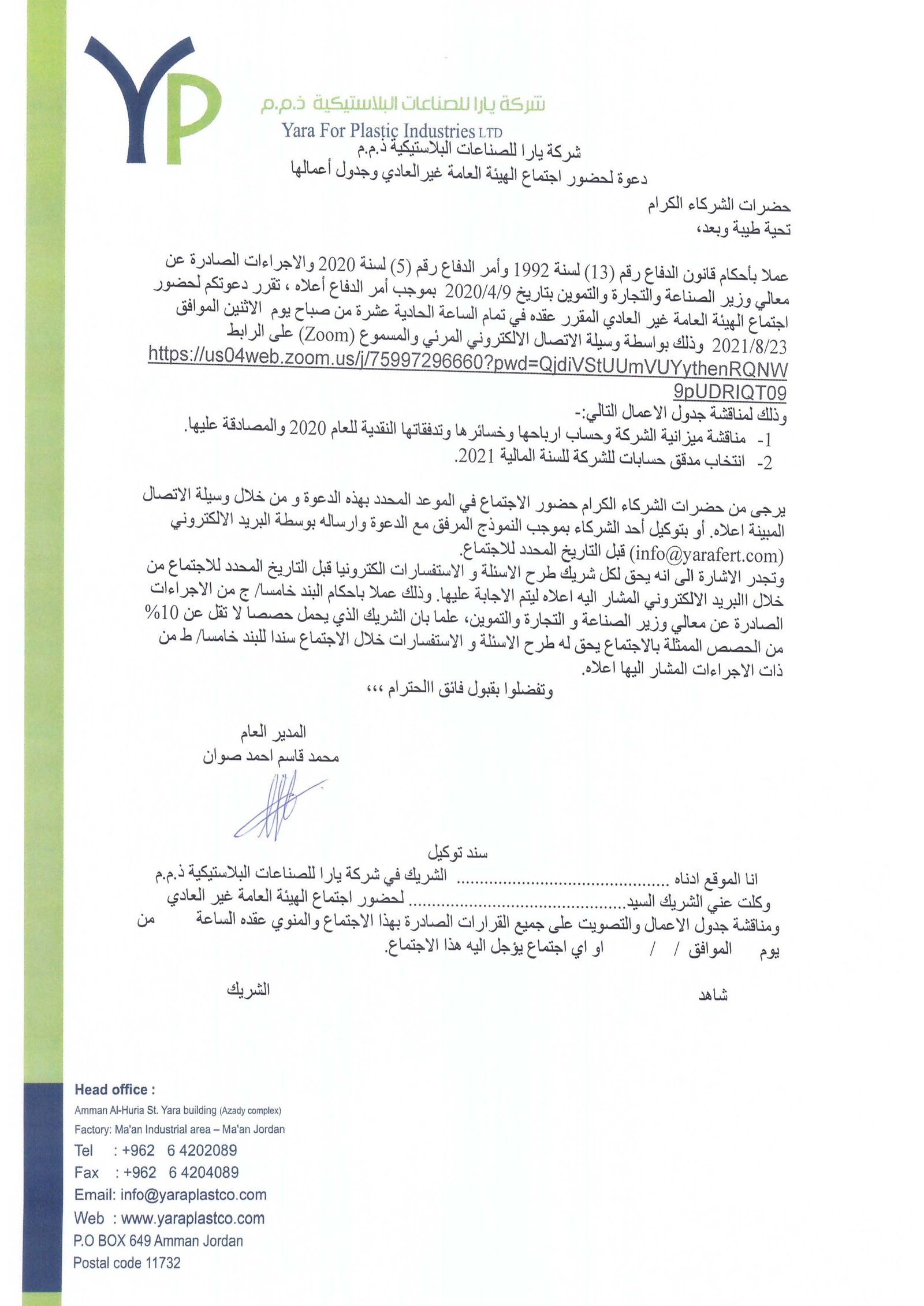 شركة يارا للصناعات البلاستيكية يارا للصناعات البلاستيكية متخصصون في صناعة العبوات البلاستيكية بكافة أنواعها دعوة لأجتماع الهيئة العامة غير العادي الساعة 12 ظهرا 16-6-2022 دعوة لأجتماع الهيئة العامة العادي الساعة 11 ظهرا 16-6-2022
